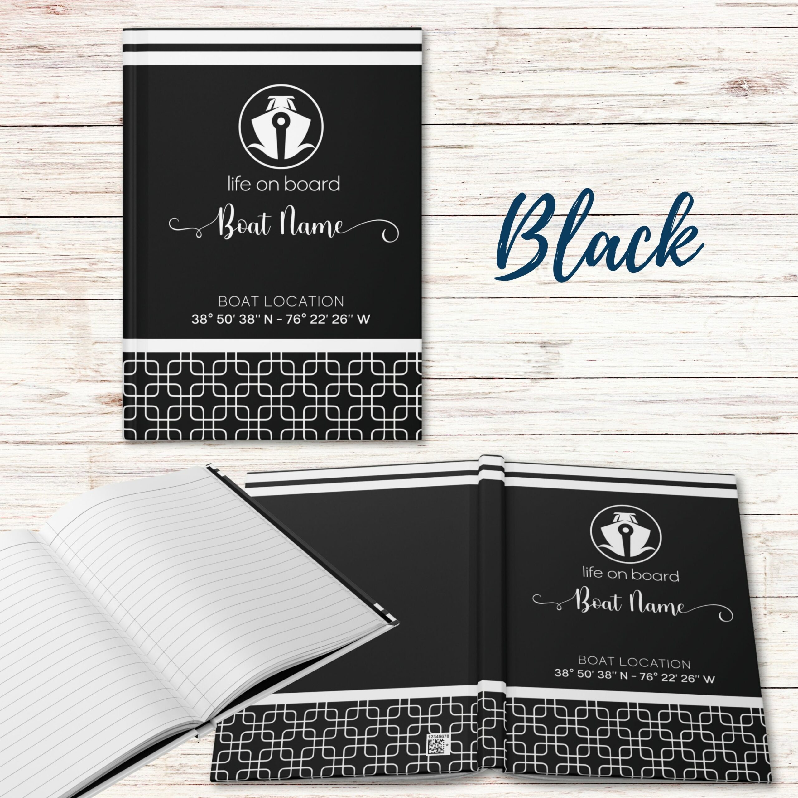 A boating journal notebook is a must-have boating accessory for every boat to journal adventures on the water! This Boat journal book is personalized with a boat name, location and the Latitude Longitude GPS coordinates of your favorite boating location (home port, lake, river, marina, bay or town – you choose!)