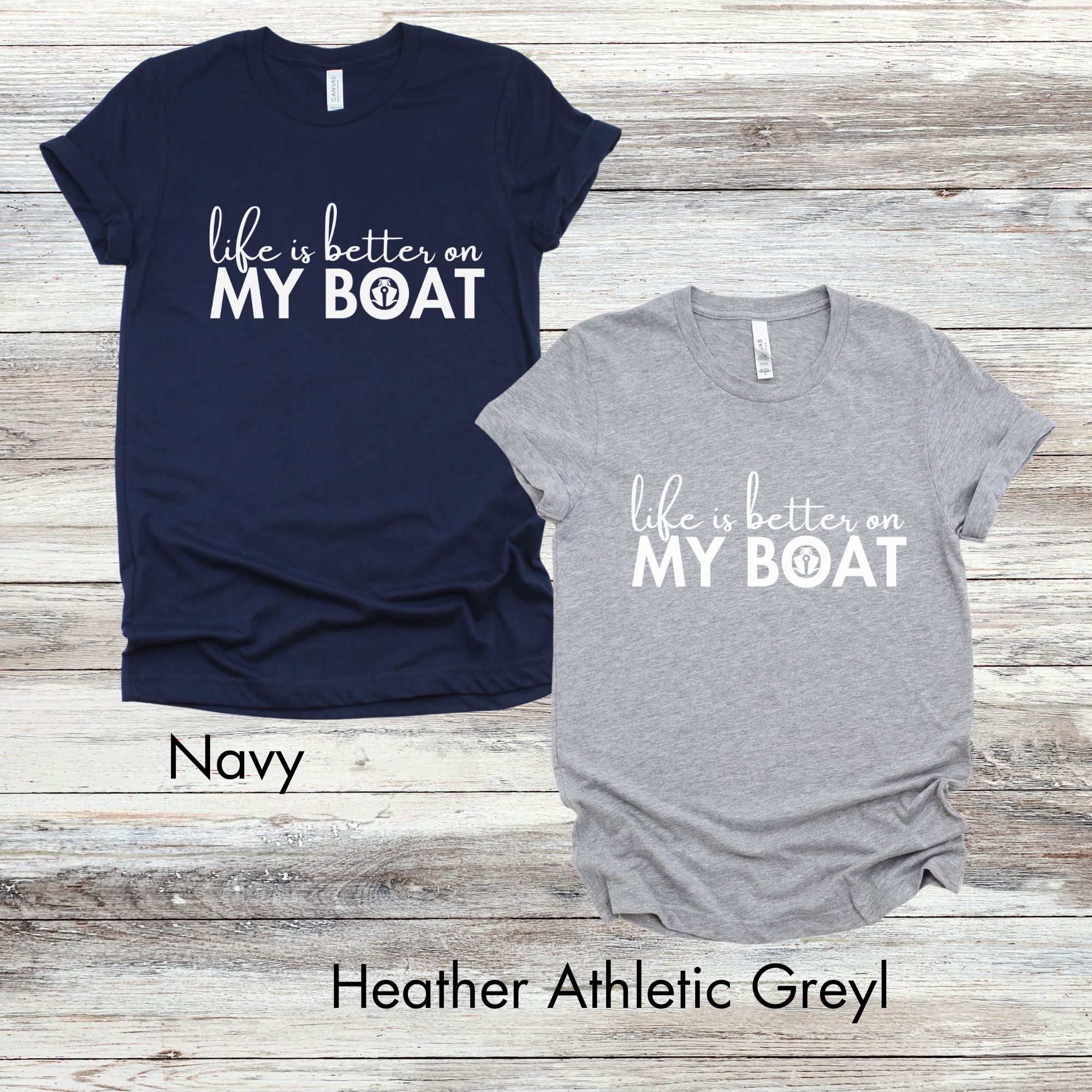 T-shirt features a twist on the “Life is Better on a Boat” saying.. because it should be “Life is Better on My Boat”! Also features our unique & modern My Boat Life anchor logo in the word boat. Available in multiple colors for men or women.